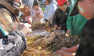当日、児童は刈り取られた大豆の房から、1粒ずつ丁寧に豆を取り出していった。指導を行った同社の小沢信宏さんは「岡上ならではの体験。地元での経験を通じて食育を意識してもらえたら」と語った。