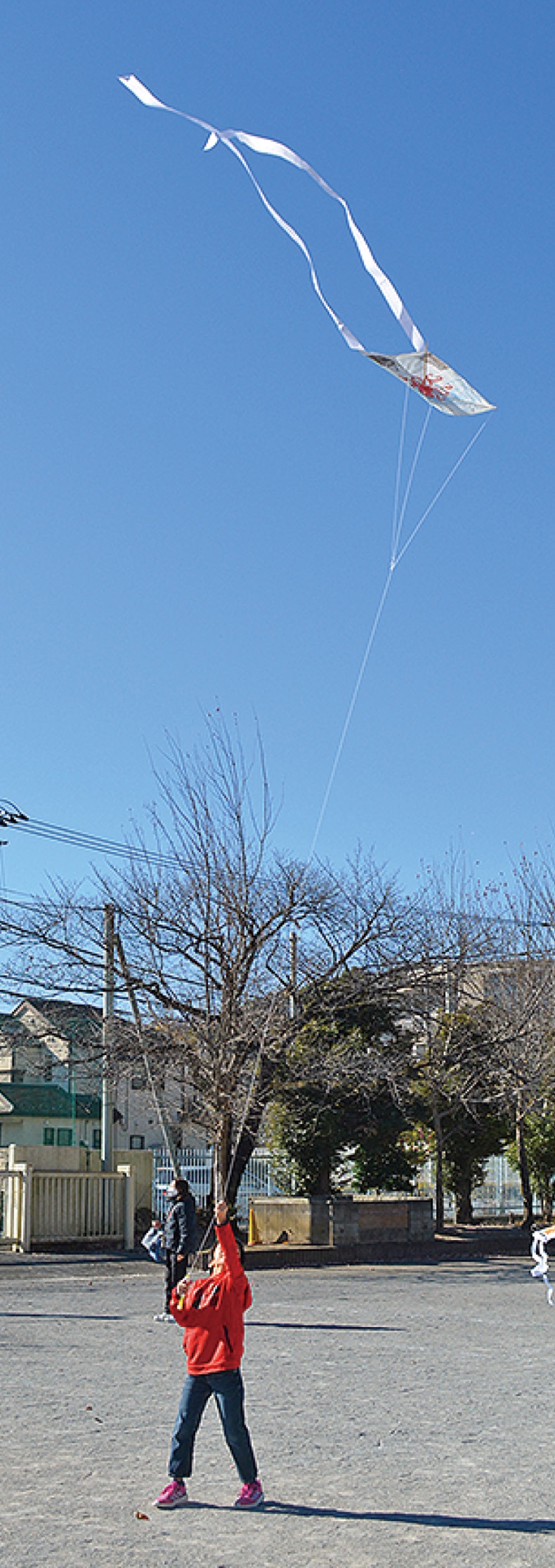 子どもたちは、好きなイラストを描いた凧を作り、校庭へ。同会の指導のもと、凧を青空へ高くあげた=写真。オリジナルのキャラクターをあしらった川良茅穂さん(小2)は「またやってみたい」と笑顔を見せた。