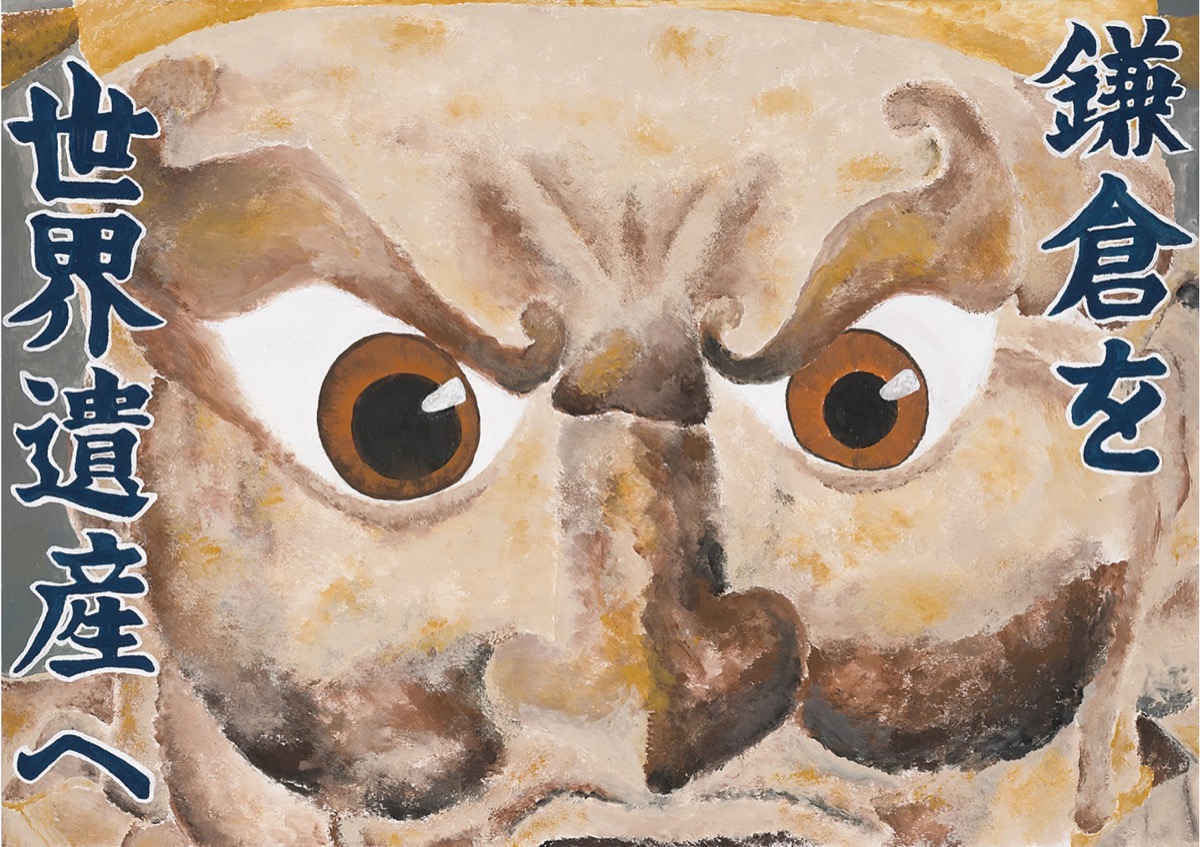 描いたのは、鎌倉市円応寺(えんのうじ)の「初江王坐像(しょこうおうざぞう)」。題材を選ぼうと、美術の資料集を見ていたとき「目力の強さに惹きつけられ、これを描きたいと思った」。昨年の夏休み期間約1カ月で制作。目力を表現するため、像全体ではなく、上唇からひたいまでを切り取り、目を中心とした構図にした。顔に寄ったことで、左右にできた余白に「鎌倉を世界遺産へ」というメッセージを目立つように入れた。水分量の少ない絵の具を使い、かすれた表現で、仏像の重厚感を伝えようと工夫したという。