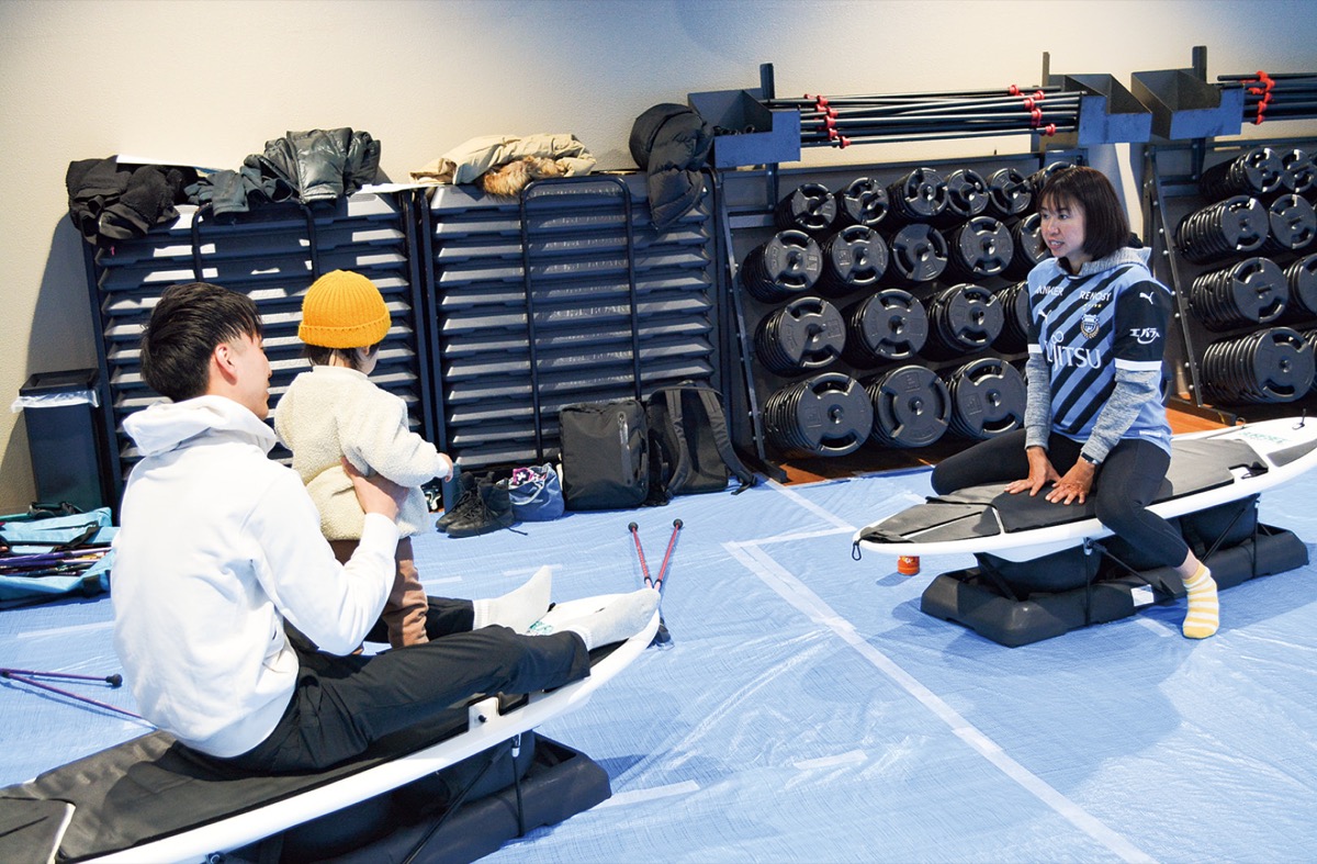 当日は、ストレッチやサーフヨガ体験=写真=などの運動ができる企画に加え、体力測定やフレイルチェック、福祉や介護の相談ができる場も設けられた。禅寺丸柿のキャラクター・かきまるくんや、同クラブのマスコット・ルネくんたちも登場。子どもと共に体験を行う姿も見られた。