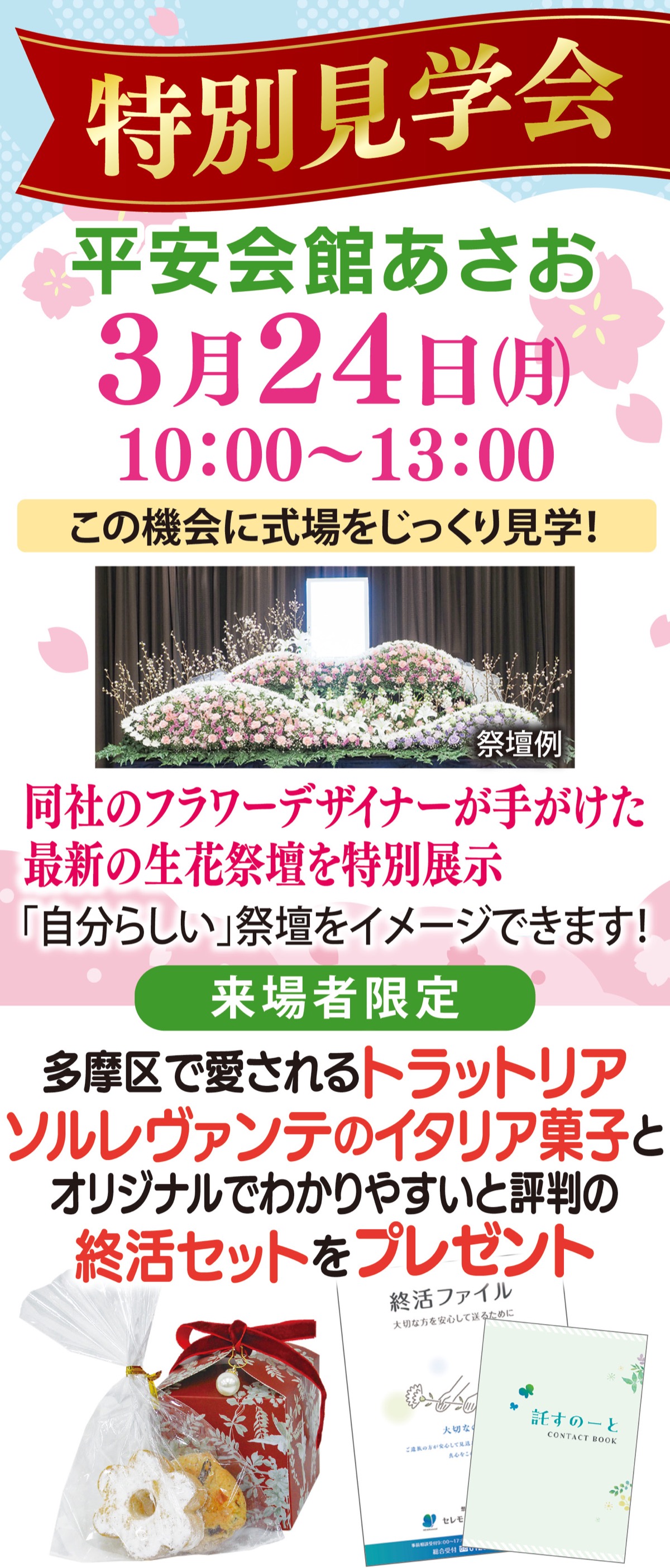 地域に寄り添い「安心と「信頼」を届けるセレモニアグループの『平安会館あさお』は3月24日(月)、特別見学会を開催する。午前10時から午後1時。予約不要。