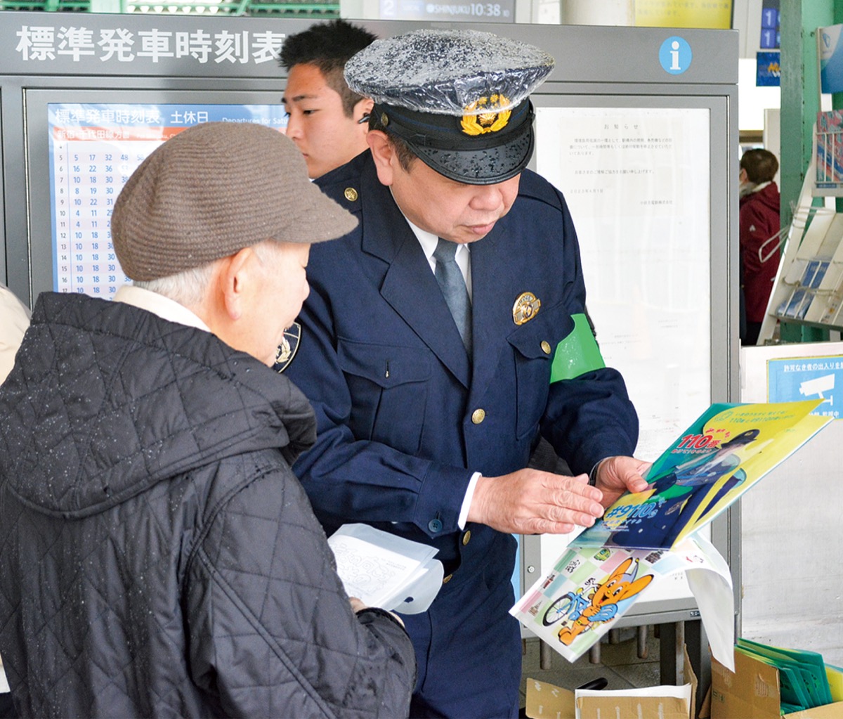 雪が舞う中、約20人の各署職員が、神奈川県警、警視庁がそれぞれ作るリーフレットを配りながら特殊詐欺防止や交通事故抑止、巡回への協力などを呼びかけた。