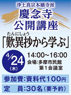 多摩区にある浄土真宗本願寺派・慶念寺(きょうねんじ)が4月24日(木)、公開講座「歎異抄(たんにしょう)から学ぶ」を開く。多摩市民館第1会議室で午後2時から4時。資料代100円。定員30人。