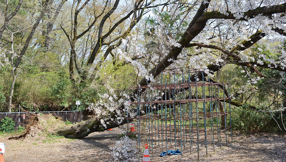 倒木が判明したのは、4月1日の朝。近隣住民から「桜の木が倒れている」と同センターに電話があり、職員が現地に向かうと、高さ約15mの桜の木がジャングルジムにもたれかかるようにして倒れていた。同日に規制線を張るなどの対応を行い、8、9日の2日間にかけて撤去された。