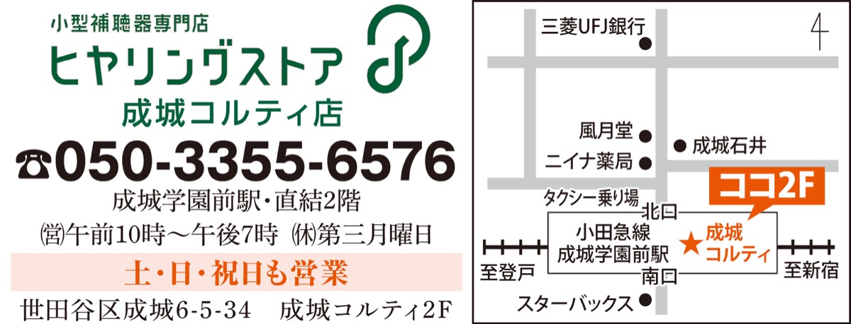 世界の7メーカーを取り扱う小型補聴器専門店「ヒヤリングストア成城コルティ店」(小田急線・成城学園駅直結2階)では「聞こえ」の不安を解消し、毎日を楽しく過ごすための各種提案や個々の相談にも丁寧に応じてくれる。