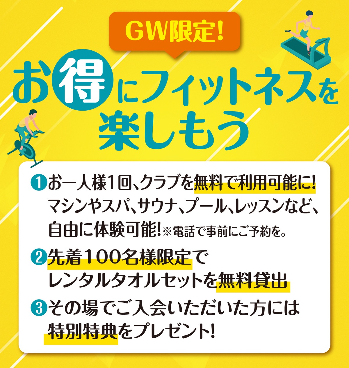 期間内は、豊富なマシン数を誇るジムエリアやプールに加え、スパやサウナ、岩盤浴などのリラクゼーション施設も無料で利用できる。ほかにもお得なサービスを実施。担当者は「運動をしなくても大丈夫。気軽に足を運んでもらうきっかけになれば。会員様もご家族、ご友人、ご近所の方を誘ってみてほしい」と呼びかける。