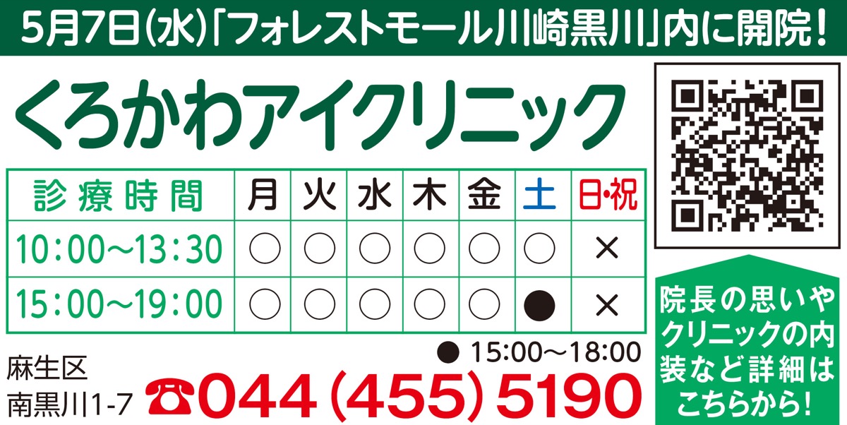 小田急多摩線・黒川駅至近に5月7日(水)、「くろかわアイクリニック」が新規開院する。