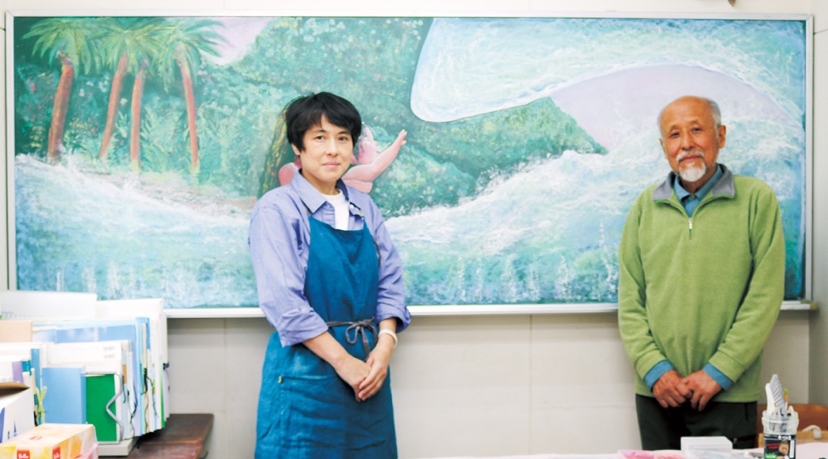 「また黒板アートを描けたら」。2人の子どもを通わせていた学習塾の塾長・上野英夫さん(73)に23年の春に相談。上野さんは高齢だったこともあり、一対一の個別指導のみを細々と続けている状況だった。そこで、使用していなかった4枚の黒板をキャンバスとして提供することに。その後、1カ月に1枚程度のペースで制作してきた。通う子どものほか、同塾内で月に1回実施されている子ども食堂に訪れる親子らにも好評を博している。