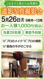 「平安会館あさお」では、遺影写真撮影会を5月26日(月)に開催する。毎回、反響が大きくキャンセル待ちの会場も出る人気の企画だ。