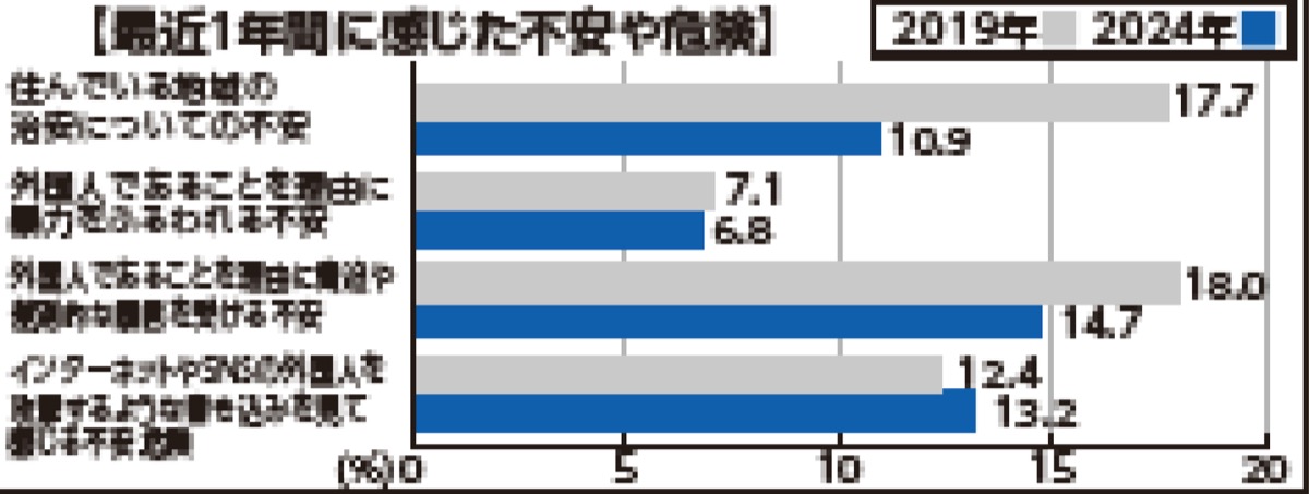 直近の1年間で感じた不安や危険に関する質問では、「住んでいる地域の治安についての不安」は前回の17・7%より大幅減の10・9%。外国人であることを理由に「暴力をふるわれる不安・危険」は6・8%(0・3ポイント減)、「脅迫や差別的な暴言を受ける不安」は14・7%(3・3ポイント減)といずれも減少したが、「外国人を攻撃するようなインターネットやSNSの書き込みを見て感じる不安・危険」は13・2%で前回の12・4%より微増した。市は「川崎市差別のない人権尊重のまちづくり条例の効果は表れているものの、条例の運用を一層、推進していく必要がある」としている。