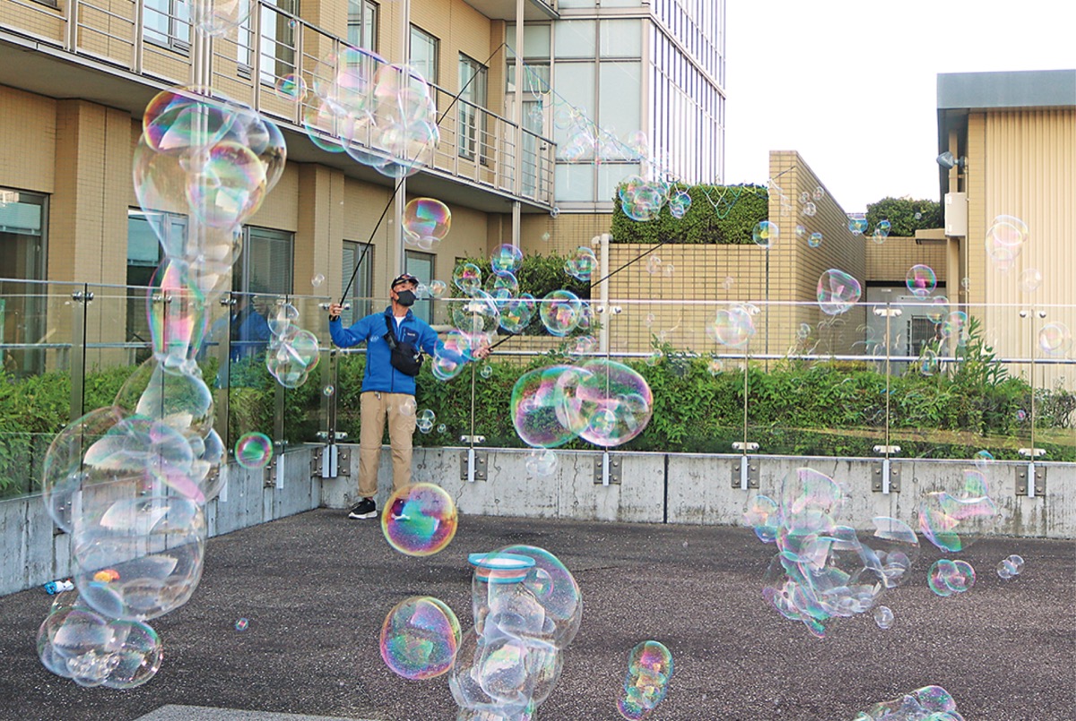 さまざまな形や大きさのシャボン玉がふわりふわりと宙に浮かぶと「わぁ、すごい」「大きい」と見ていた人から弾んだ声が聞かれた。入院中の患者は「シャボン玉で目線が自然と空へ。気持ちも上向いた」と話した。長島悟郎病院長は「多くの笑顔が見られた。感謝したい」と述べた。シャボン玉オヤジは「泡の力で老若男女問わず、幸せを届けられた。子どもたちも、すごく喜んでくれた」と語った。