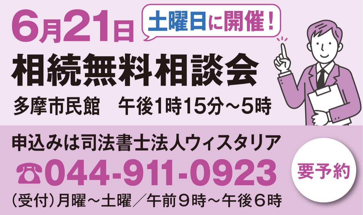 地元・多摩区に事務所を構える「司法書士法人ウィスタリア」は6月21日(土)、多摩市民館第4会議室を会場に、相続に関する無料相談会を開催する。午後1時15分から5時。事前予約制。