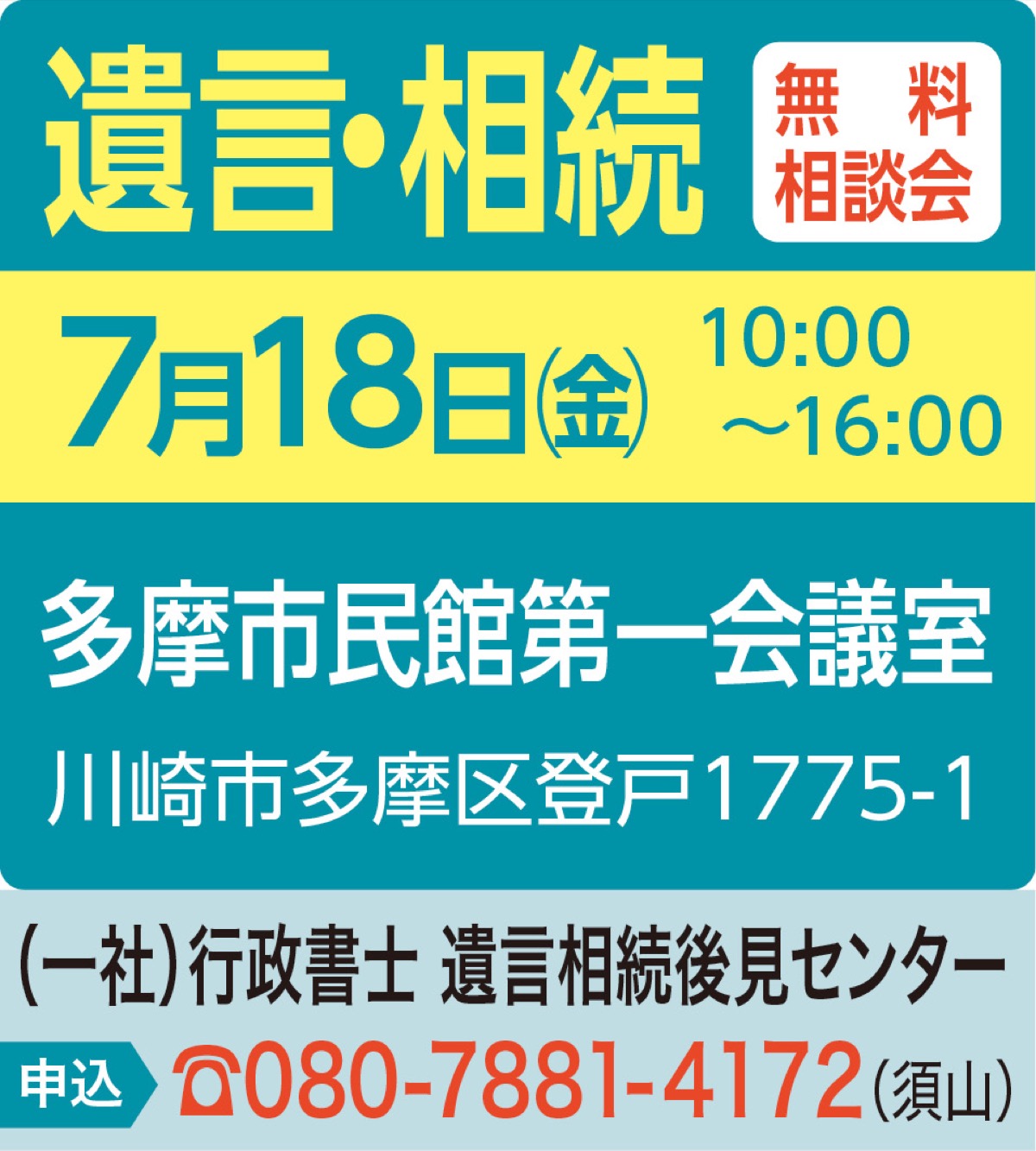 (一社)行政書士遺言相続後見センターが7月18日(金)、午前10時から午後4時、多摩市民館第一会議室(多摩区登戸)で、第41回無料相談会を開催する。予約優先、当日参加可。