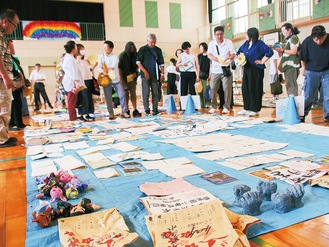 事前に掘り出したカプセルを当日朝に開封。樋口彰校長らが中身を取り出した。入っていた品は体育館に並べられ、その日の午後、当時の在校生らが受け取りに訪れた。