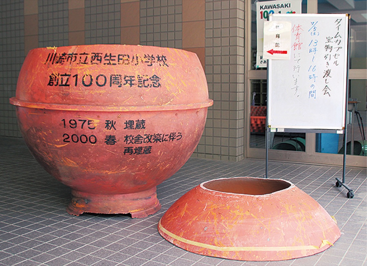 カプセルは同校が創立100周年を迎えた際、当時在籍していた児童や教職員らの絵や作文、書、工作などを詰め、地域有志の協力で正門脇の地中に埋められた。地上には50年後にカプセルを掘り起こすことを記した石碑が設置された。