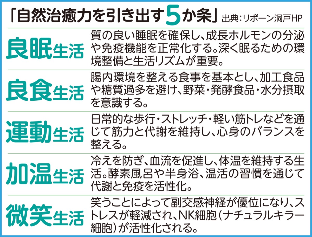 私は2012年、直腸がんと胃平滑筋肉腫の2つのがんを同時に罹患。直腸がんは寛解しましたが、胃の平滑筋肉腫は再発し、肺に転移。「ステージIV」と診断されました。平滑筋肉腫は発症例が極めて少ないがんであり、標準的な治療法が確立されておらず、抗がん剤治療も効果は限定的とされています。私は手術・抗がん剤治療以外の選択肢を模索、その中で出会ったのが、岐阜の医療施設「リボーン洞戸」と、その院長である船戸崇史先生の考え方です。「がんには、がんの言い分がある」「がんは”生き方”の通知表」。その言葉に、私は強く心を動かされ、これまでがんの背景にある生活習慣や働き方、そして心の抑圧に向き合ってこなかったことに気づかされました。治療に専念するだけで、がんが私に何を伝えようとしているのか、自分の生き方に目を向けることはしませんでした。過度なストレス、無理な働き方、感情を抑圧するような日常…。がんの根底には、そうした「生き方のひずみ」があったと思います。船戸先生は「本来、人の体は治りたがっており、それを邪魔する生き方、我慢、頑張る、頑固の”3Gの生き方”が、がんを引き起こす」とおっしゃっています。振り返れば私も、まさにこの3Gの生き方をしていました。「こうあるべきだ」「期待に応えなければ」「弱音は吐けない」。そうやって自分を追い込んできた結果、がんという形で現れたのかもしれません。私は船戸先生が提唱する「自然治癒力を引き出す5か条」を取り入れ、初めて自分の体や心の声に正面から向き合うようになりました。それは単なる健康法ではなく、まさに「生き方の再設計」と呼べる取り組みです。
