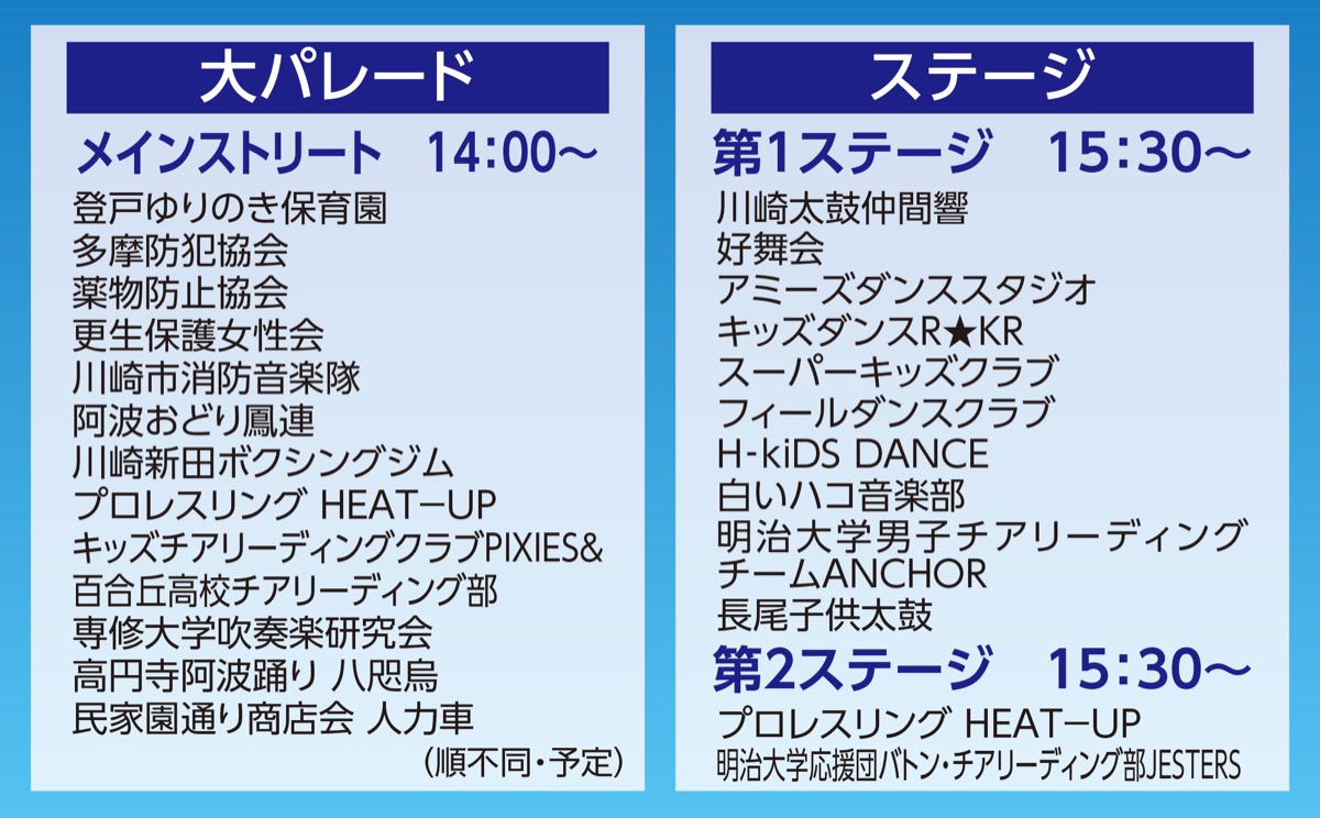 大通りの第1ステージではキッズダンスや子ども太鼓など10団体が日ごろの練習の成果を発表(3時30分〜)。クロス向ヶ丘横に設置される登戸いこい公園内の第2ステージでは野外プロレスや大学生のチアリーディングなどが披露される(3時30分〜)。通り沿いには商店が軒を連ね、2時から8時15分まで飲食物などが販売される。会場内には脱炭素化社会のブース、人力発電かき氷自転車も設置される。