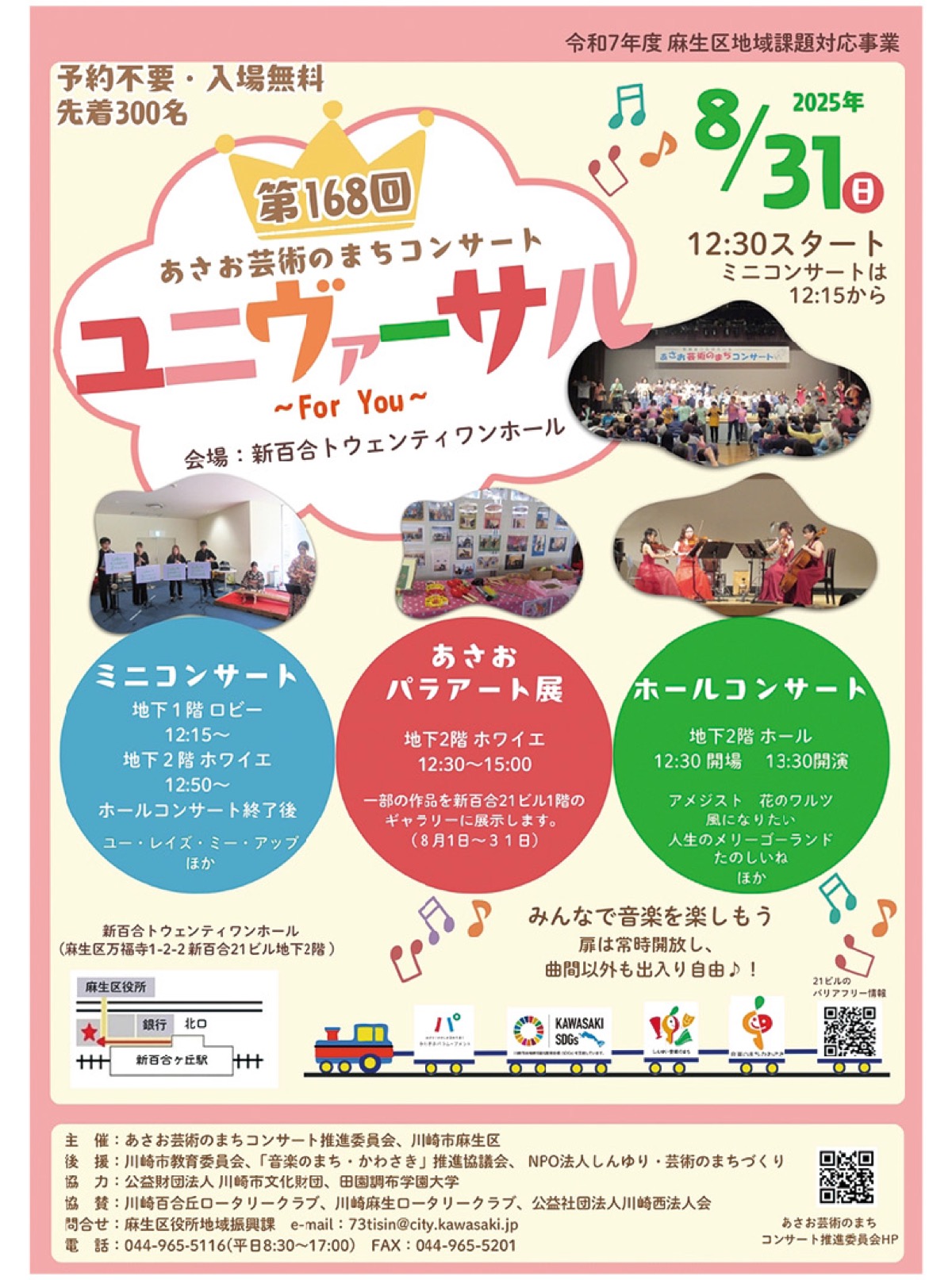 あさお芸術のまちコンサート「ユニヴァーサル〜For You」が、8月31日(日)に新百合トウェンティワンホールで開催される。午後0時30分から(ミニコンサートは15分から)。入場無料。