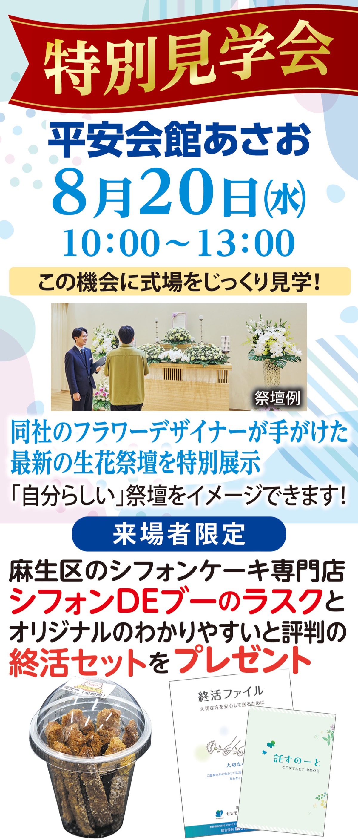 葬儀については分からないことが多く、費用面や葬儀の流れ、「突然喪主になったらどうすればいいの…」などの心配はつきもの。見学会では経験豊富なプランナーに費用や準備など、気になる内容について質問・相談が気軽にできるので安心。来場者には、同社葬祭ディレクターが監修、評判の「エンディングノート」や終活ファイルを進呈する。