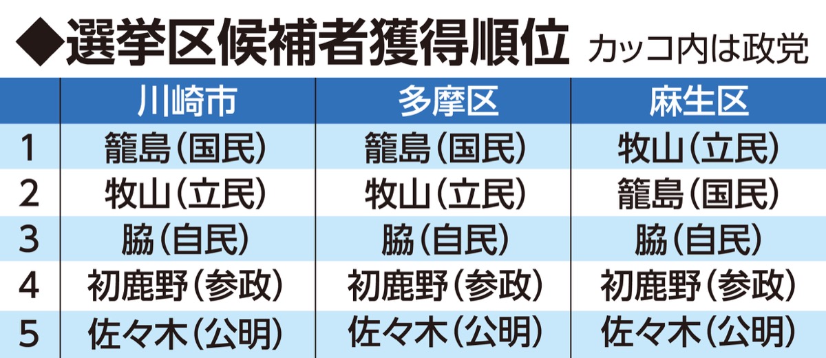 選挙区候補者の得票数のうち、最も多く獲得したのは国民新人・籠島彰宏氏が14万8045票。2位の立民現職・牧山弘惠氏が11万3587票。自民新人・脇雅昭氏が10万9273票、参政新人・初鹿野裕樹氏が9万6899票と続いた。