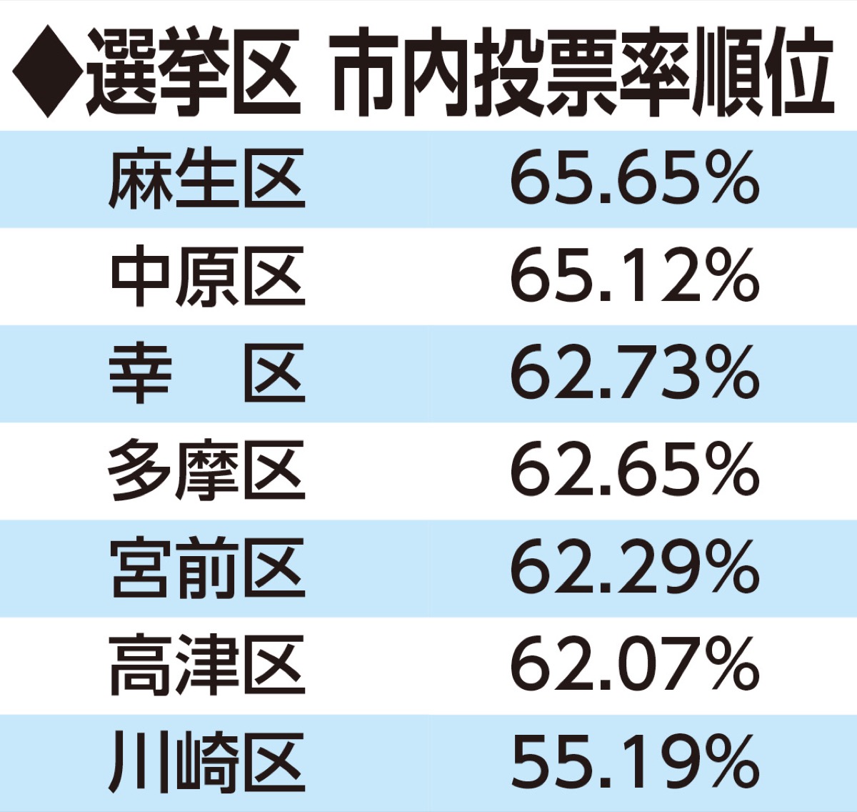 7月20日に投開票された参院選の選挙区での川崎市の投票率は62・19%で、2022年の前回を6・61ポイント上回った。多摩区は62・65%で前回比で6・74ポイント上昇した。麻生区は65・65%で、前回を5・55ポイント上回り、市内トップ。同区は県内の市区町村の中でも最も投票率が高かった。