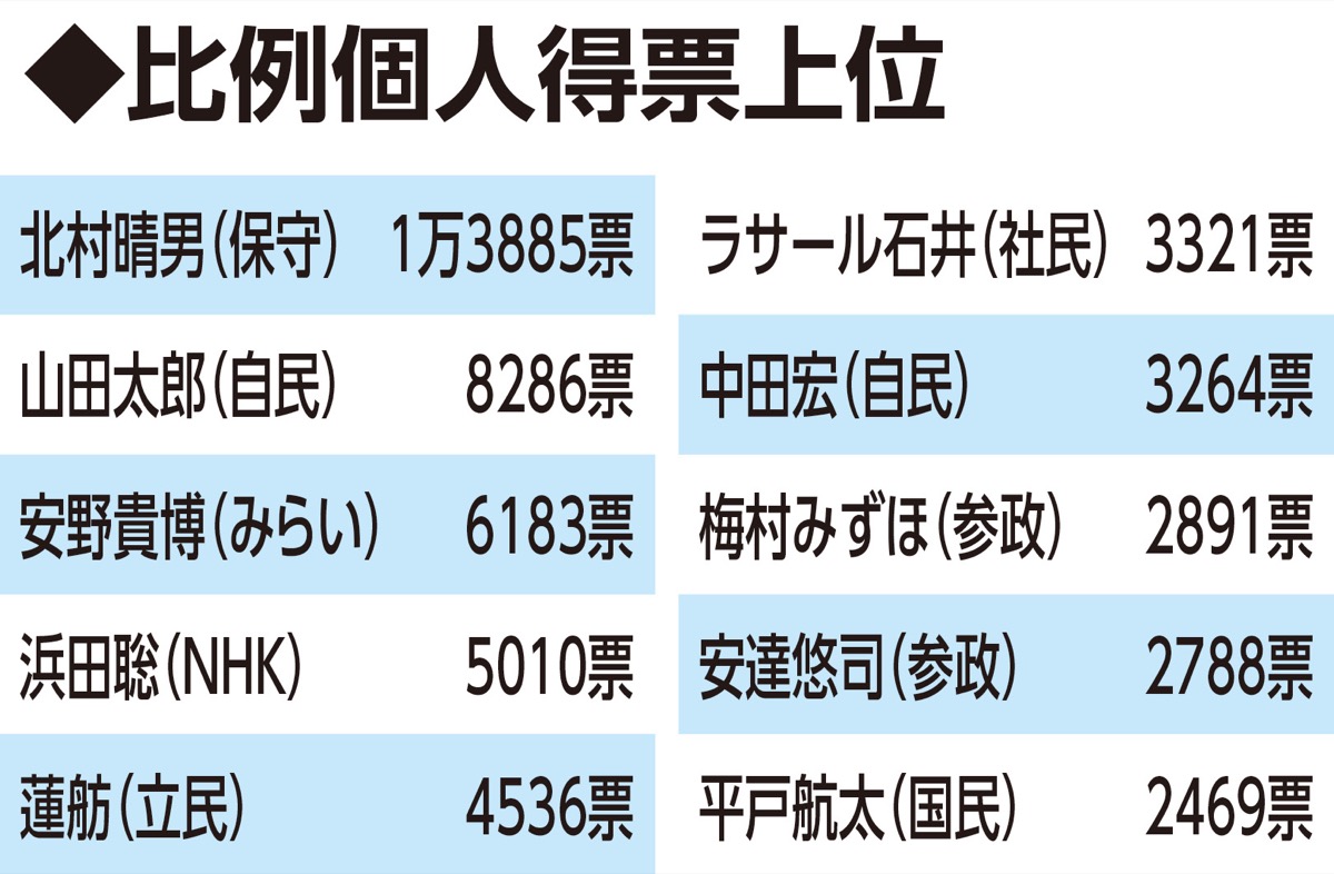 比例で、個人別得票数で最多だったのは、日本保守党新人・北村晴男氏の1万3885票。2位が自民現職・山田太郎氏の8286票だった。初の議席を獲得した政治団体「チームみらい」の新人・安野貴博氏が6183票で3位となった。