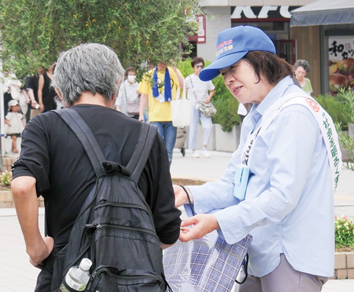 保護司会や社会福祉協議会、町会連合会、民生委員児童委員協議会などで構成されている同運動の麻生区推進委員会推進委員ら45人が参加した。麻生警察署など関係団体に加え、田園調布学園大学の学生6人も参加し、同駅南口デッキで通行人にチラシやうちわ、汗拭きシートなどの啓発物を配布。犯罪や非行の防止や、再犯防止のために立ち直りを支える意義などを伝えた。
