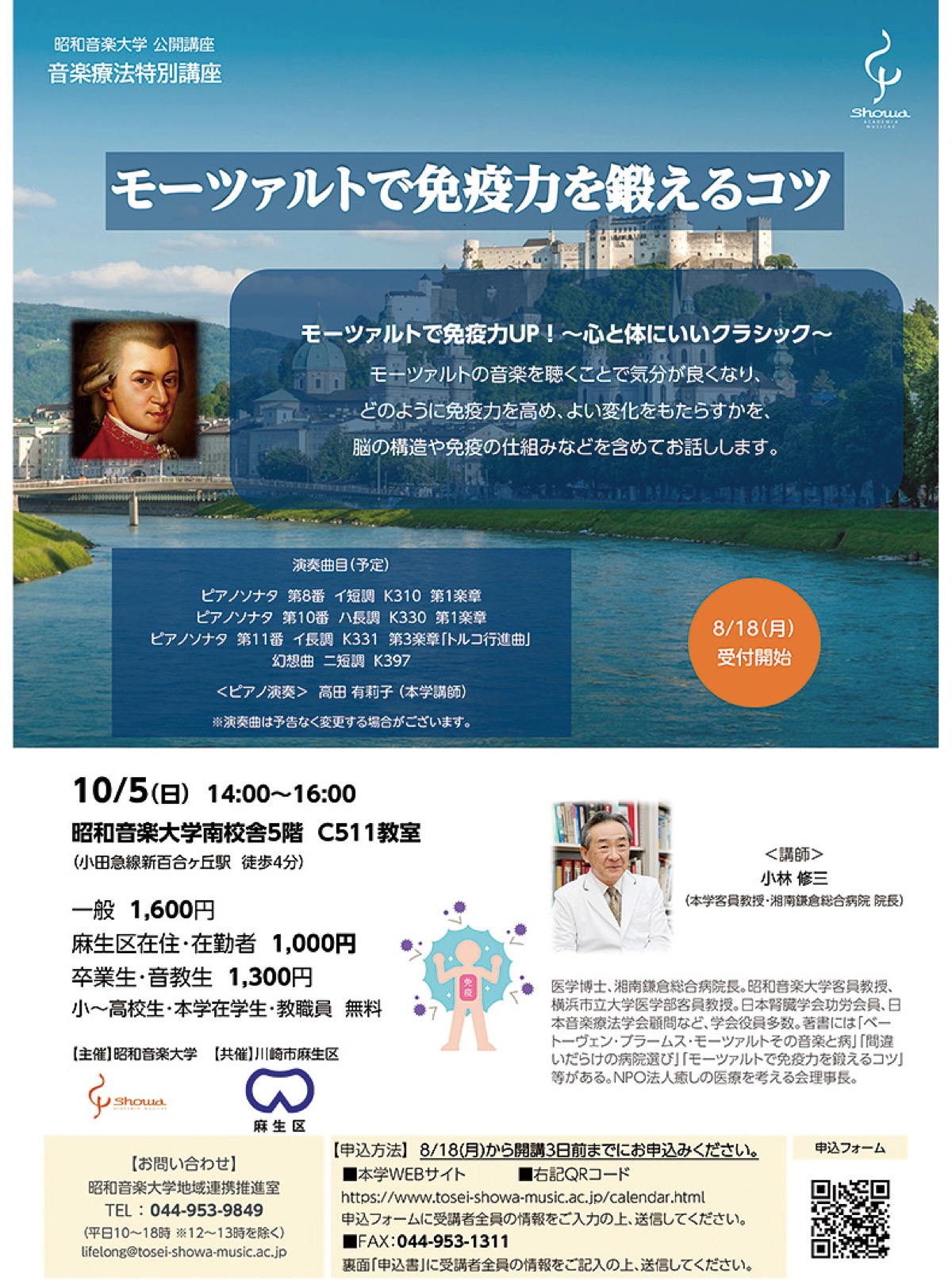 音楽療法特別講座として麻生区と共催で行われる。講師は湘南鎌倉総合病院院長で、同大客員教授の小林修三氏。モーツァルトの音楽を聴くことで、どのように免疫力が高まり、良い変化をもたらすのか、脳の構造や免疫の仕組みなどを含めて解説する。加えて、同大講師によるモーツァルトの曲目のピアノ演奏も予定。