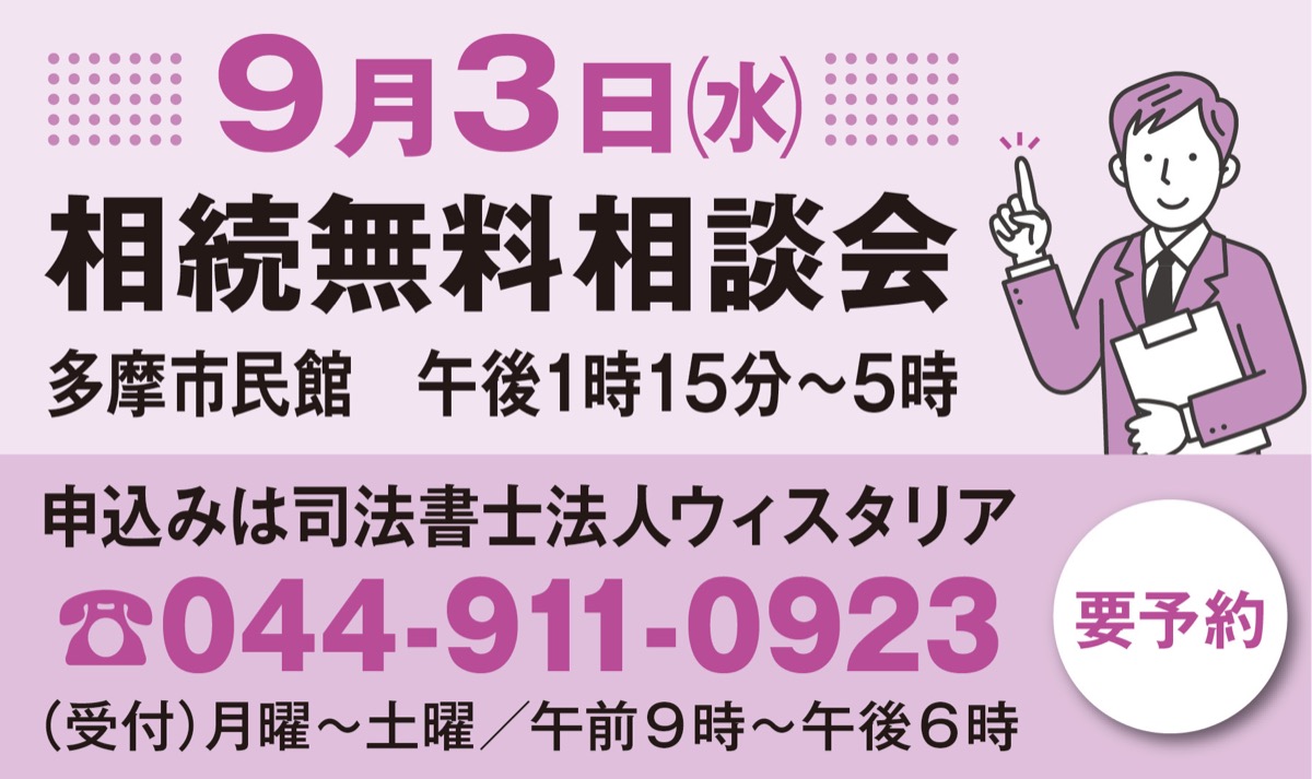 地元・多摩区に事務所を構える「司法書士法人ウィスタリア」は9月3日(水)、多摩市民館第4会議室を会場に、相続に関する無料相談会を開催する。午後1時15分から5時。事前予約制。