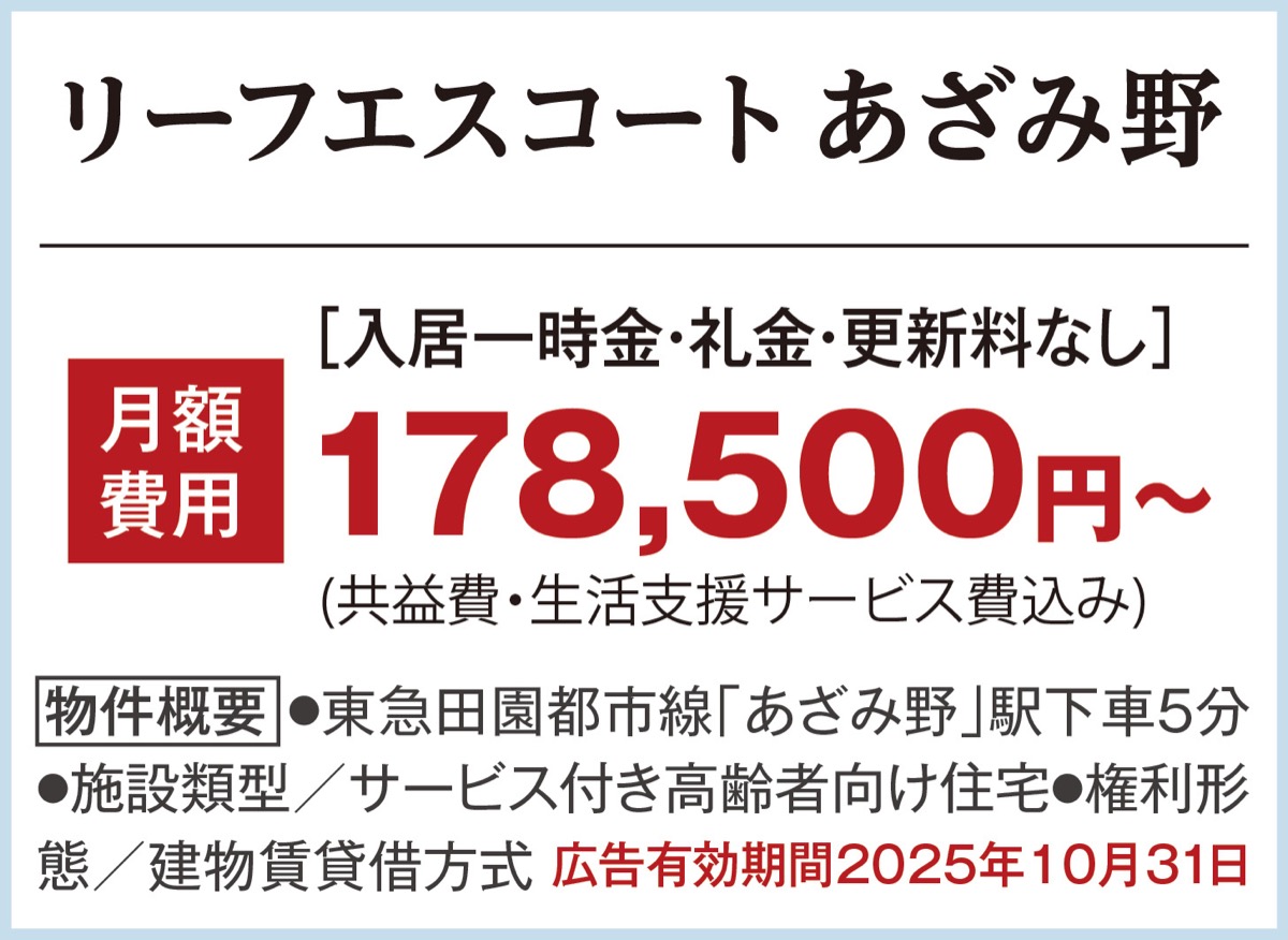 小田急線新百合ヶ丘駅から東急田園都市線あざみ野駅までバスに揺られること約30分。あざみ野駅から徒歩5分の閑静な住宅街の中に建つのが、サービス付き高齢者向け住宅「リーフエスコートあざみ野」だ。