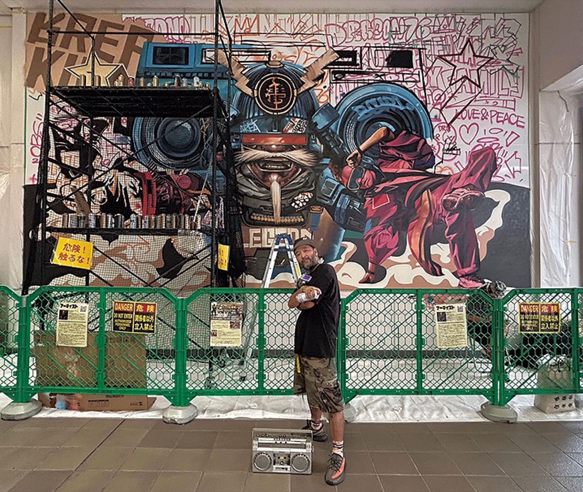 Dragon76は2019年と20年に、市役所本庁舎の工事現場の仮囲いに巨大なミューラルアートを制作した実績があり、川崎での壁画制作は3度目。今回のテーマは「ニューヨークで生まれたブレイキンの文化が日本独自の発展を遂げ、再び世界に広がるイメージ」という。