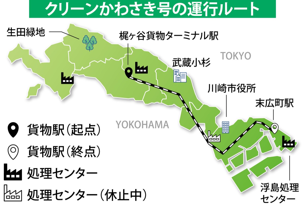 「クリーンかわさき号」は1995年10月に国内初の廃棄物専用列車として運行を開始した。発端は90年代初めの川崎市北部の人口急増だった。ごみ処理が追い付かず、市はJR貨物の路線を活用し、北部地域で発生した廃棄物を浮島処理センターへ運ぶ運用を開始。普通ごみや粗大ごみ、空き缶や空き瓶など、時代と共に積み荷が増えたが、市内のごみ処理施設の整備が進むと共に積み荷の種類が減り、今では焼却灰とプラスチック資源のみに。
