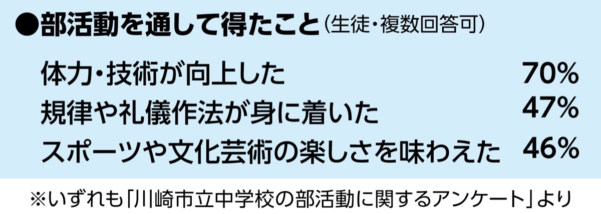 川崎市内の市立中学校の部活動の状況としては(24年5月時点)、52校で計749の部活動があり、内訳は運動部が520、文化部は229。全生徒2万9922人のうち約82%にあたる2万4659人が部活動に参加しており、市教委によれば、これまでのところ人員減で部を廃止したケースはないという。