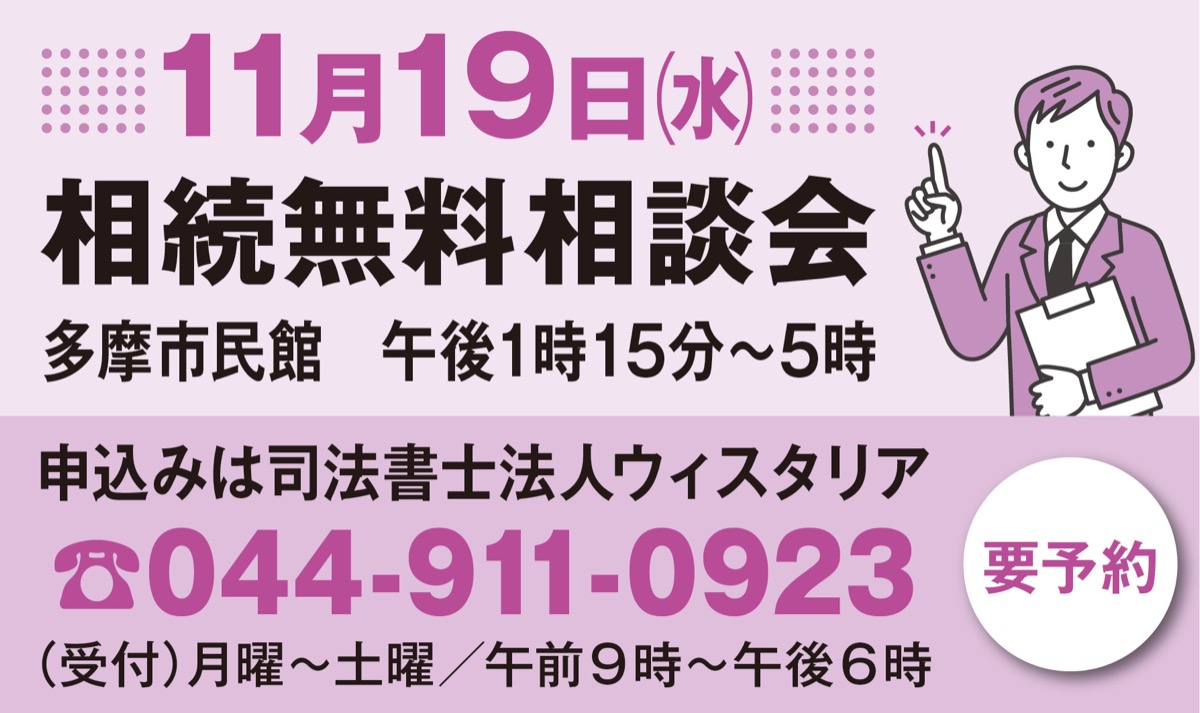 地元・多摩区に事務所を構える「司法書士法人ウィスタリア」は11月19日(水)、多摩市民館第4会議室を会場に、相続に関する無料相談会を開催する。午後1時15分から5時。事前予約制。