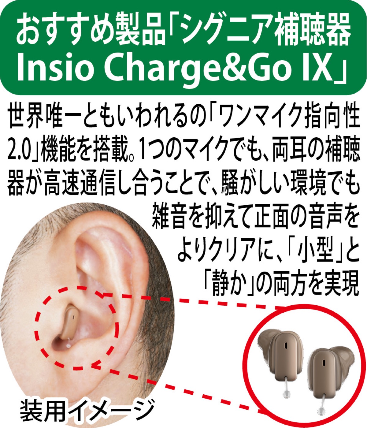 いま、同店おすすめのシグニア補聴器の新製品=写真左=も、セール対象。騒がしい環境の中での会話をより鮮明にし、目の前の人の声に集中できるよう雑音を抑えてくれる高性能タイプで、充実の保証やアフターフォローも人気の秘訣。認定補聴器技能者の資格を持つ藤多詩織店長は「最新の高性能機種で、お出かけや会話をより楽しんで頂けると思います」と話す。また12月20日までの決算セール期間中は混雑が予想されるため「必ずご来店予約をお願いします」と呼び掛けている。
