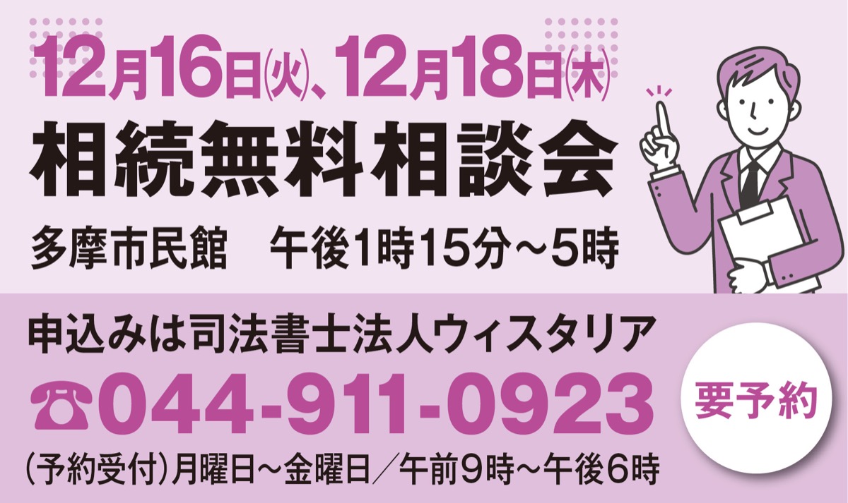 地元・多摩区に事務所を構える「司法書士法人ウィスタリア」は12月16日(火)と18日(木)に、多摩市民館第4会議室で相続に関する無料相談会を開催する。午後1時15分から5時。事前予約制。