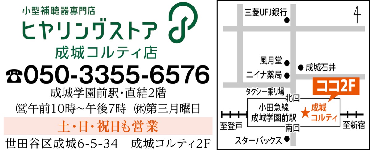世界7大メーカーを取り扱う小型補聴器専門店「ヒヤリングストア成城コルティ店」(小田急線・成城学園前駅直結2階)では「オープン2周年記念フェア」を開催中。これは3月末までに同店の補聴器を購入した人を対象に全機種を値引き対象とした特別価格を提示してくれるもの。
