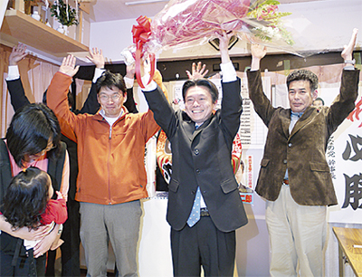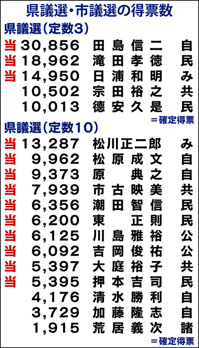 県議選では、3議席を5人の候補が争った。その中でトップ当選したのは、自民党現職で県議会議長の田島信二氏で30856票を獲得。次いで民主党現職の滝田孝徳氏、3議席目はみんなの党新人の日浦和明氏で初当選を果たした。共産党新人の宗田裕之氏、民主党現職の徳安久是氏はあと一歩及ばなかった。