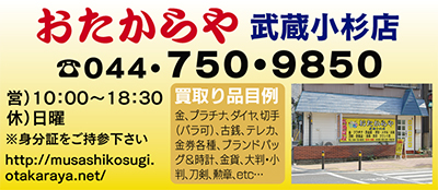 店長の温かい人柄と高額査定で人気を集めているのが『おたからや武蔵小杉店』。金やプラチナ、ダイヤの他、切手や古銭など幅広い買い取りを行っている。他店をまわった末、「やっぱりここが一番納得のいく査定!」と好評。信頼が高く、リピーターも多いという。「駅から近くはない分(北口より4分)家賃も安く、無駄な経費や人件費を使っていないので常に高額買い取りが出来るんです」と大澤店長。