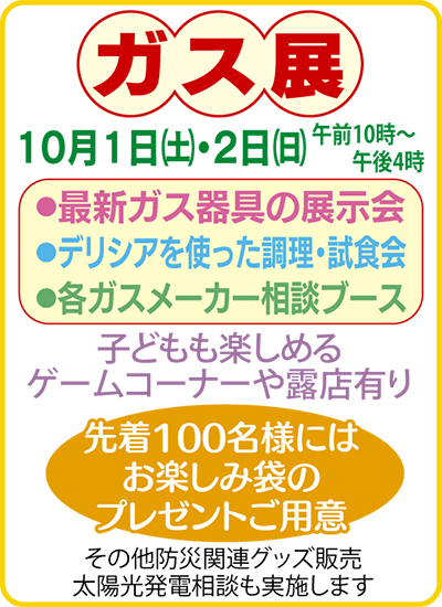 当日は、最新のガスコンロやキッチン、ファンヒーターの展示会や多彩な調理機能を持つコンロを使った調理実習と試食会が行われるほか、専門家による相談会が実施される。「ガス器具の調子が悪く冬に向けて最近のものを見てみたい」。「IHかガスか迷っている。専門家の話が聞きたい」という方はこの機会に相談してみよう。