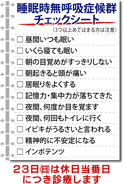 「イビキは睡眠時無呼吸症候群の一番のシグナルです。この病気は本人に自覚がなく、家族から指摘されて気づくことがほとんど。高血圧や脳卒中・脳梗塞、心筋梗塞を起こす危険性は3〜4倍になり、メタボリックシンドロームや糖尿病との関連もあります。睡眠中の酸欠状態が血液をドロドロにし、細い血管が詰まりやすくなります。昼間の眠気が仕事に支障をきたし、居眠り運転による交通事故の原因となることも。この病気と診断されたドライバーの約40%が居眠り運転を経験しているといいます」と鈴木院長。