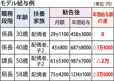 月給の引下げ勧告は3年連続となり、この給与勧告を受け入れると全職員の平均年間給与は勧告前の640万5000円から1万3000円引下げられ、639万2000円となる。病院・交通・水道などの企業職を含んだ場合は約1億7000万円の人件費削減となる見込み。なお、若年層については改定を行わず、中高年層を中心に引き下げ、管理職層を平均改定率より大きく引き下げる。
