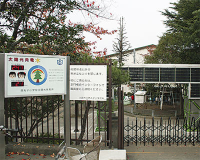 耐震化・エコ化・ICT(情報通信技術)化を進め21世紀にふさわしい学校づくりを目指す、文科省が提唱する「スクール・ニューディール」構想の交付金を利用し、昨年より市内小中学校25校に太陽光パネルが設置されました。うち24校は、10kw出力の設置ですが、西丸子小学校は唯一100kwもの設置に至りました。