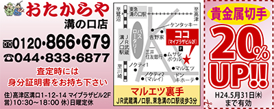 おたからや溝の口店では、同店限定の高価買取フェアを5月末まで実施中。今なら、貴金属・切手の買取額が通常より20%アップに(インゴット除く)。つぶれた指輪、切れたネックレス、片方だけのピアス、金歯など1点からでも、無料で査定を行っている。