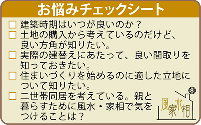 「風水や家相のうえでよい間取りやトラブルへの対処法は?」「土地の購入から考えているが、時期・方角などのアドバイスが欲しい」など家にまつわる相談を具体的にできる機会なので、お見逃しなく。