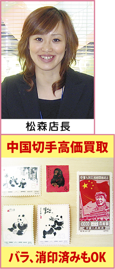 おたからや溝の口店では、高価買取フェアを実施中。今なら本紙持参で通常査定額より20%アップに(インゴット除く/6月30日まで)。同店では中国切手専門の鑑定士が丁寧に査定。バラ、シート、消印済みの切手もOK。「中国の経済状況により切手の値段が変動するのでお早めに。郵便局で現金化もできないので価格下落中の日本切手も今すぐ」と店長の松森さん。