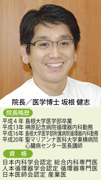 心臓の専門医(循環器専門医)として、高血圧や動脈硬化、不整脈、狭心症、心筋梗塞といった診療や呼吸器科・一般内科に対応している。坂根院長は「循環器疾患は、喫煙や食事、運動、飲酒などの生活習慣との関連が深いので、薬物による治療だけでなく、生活習慣改善の指導がとても大事です。糖尿病や高血圧、高脂血症、高尿酸血症などは、循環器系疾患を合併することが多いので、循環器疾患、とくに狭心症や心筋梗塞に注意ください」と話しており、循環器系疾患のリスクを減らすため睡眠時無呼吸症候群の検査や禁煙外来も受け付けている。