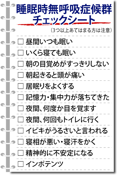 「この病気は本人に自覚がなく、家族や友達から指摘されて気づくことがほとんど。日本の患者数は約300万人と推測されており、30代〜50代の働き盛りの男性に多い傾向があります。高血圧や脳卒中・脳梗塞、心筋梗塞を起こす危険性は3〜4倍になり、メタボリックシンドロームや糖尿病との関連も。睡眠中の酸欠状態が血液をドロドロにし、細い血管が詰まりやすくなります。昼間の眠気が仕事に支障をきたし、交通事故の原因となることも」と鈴木院長。