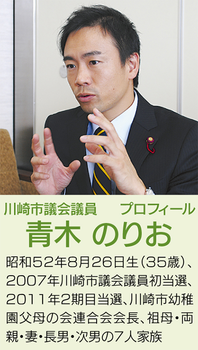 中原区選出の原典之市議(自民党)が、高津区選出の青木のりお市議(自民党)と対談。子どもを幼稚園に通わせる育児中のパパで、年齢は35歳。消防団に所属し、あだ名も”のり”と、何かと共通点が多い2人が、まちづくり委員会副委員長・前委員長の立場から、川崎市のまちづくりについて思いを語った。