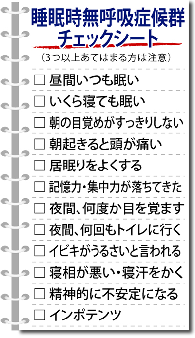「大きなイビキが突然止まる」「寝ている時に呼吸が止まっている」―こうした症状で指摘された場合は睡眠時無呼吸症候群(SAS)の疑いがあるという。